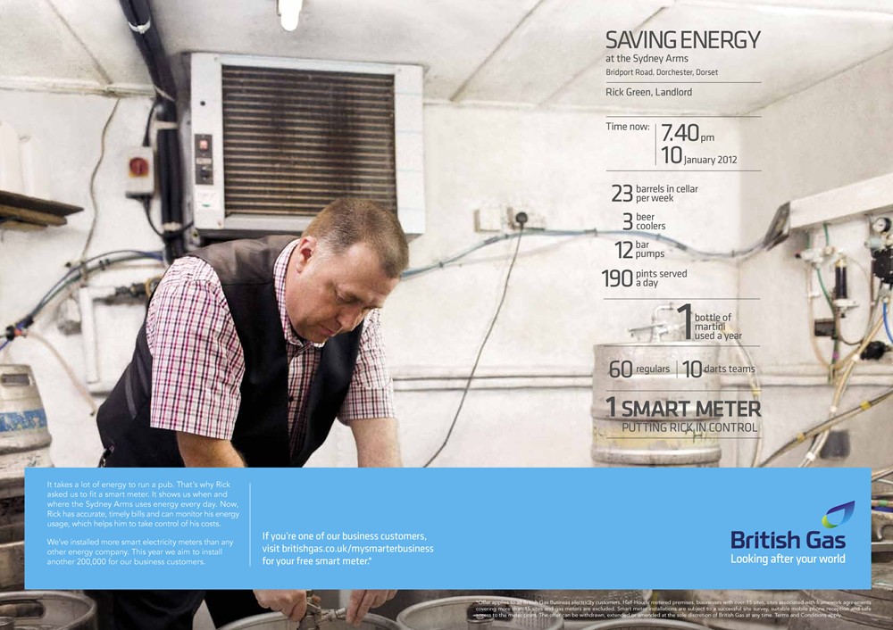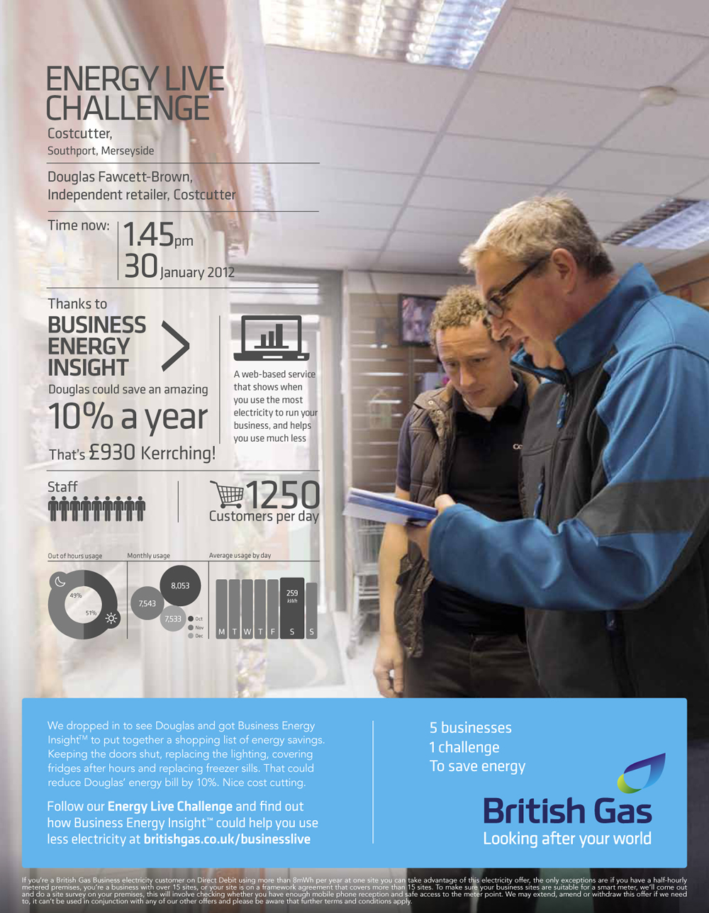 We took 5 businesses and challenged them to reduce their energy usage with help from British Gas. We followed each business, from first energy audit and energy saving measures recommended, right through to the final results. Our multi-channel campaign showed their experiences via reportage-style press ads and online video content.