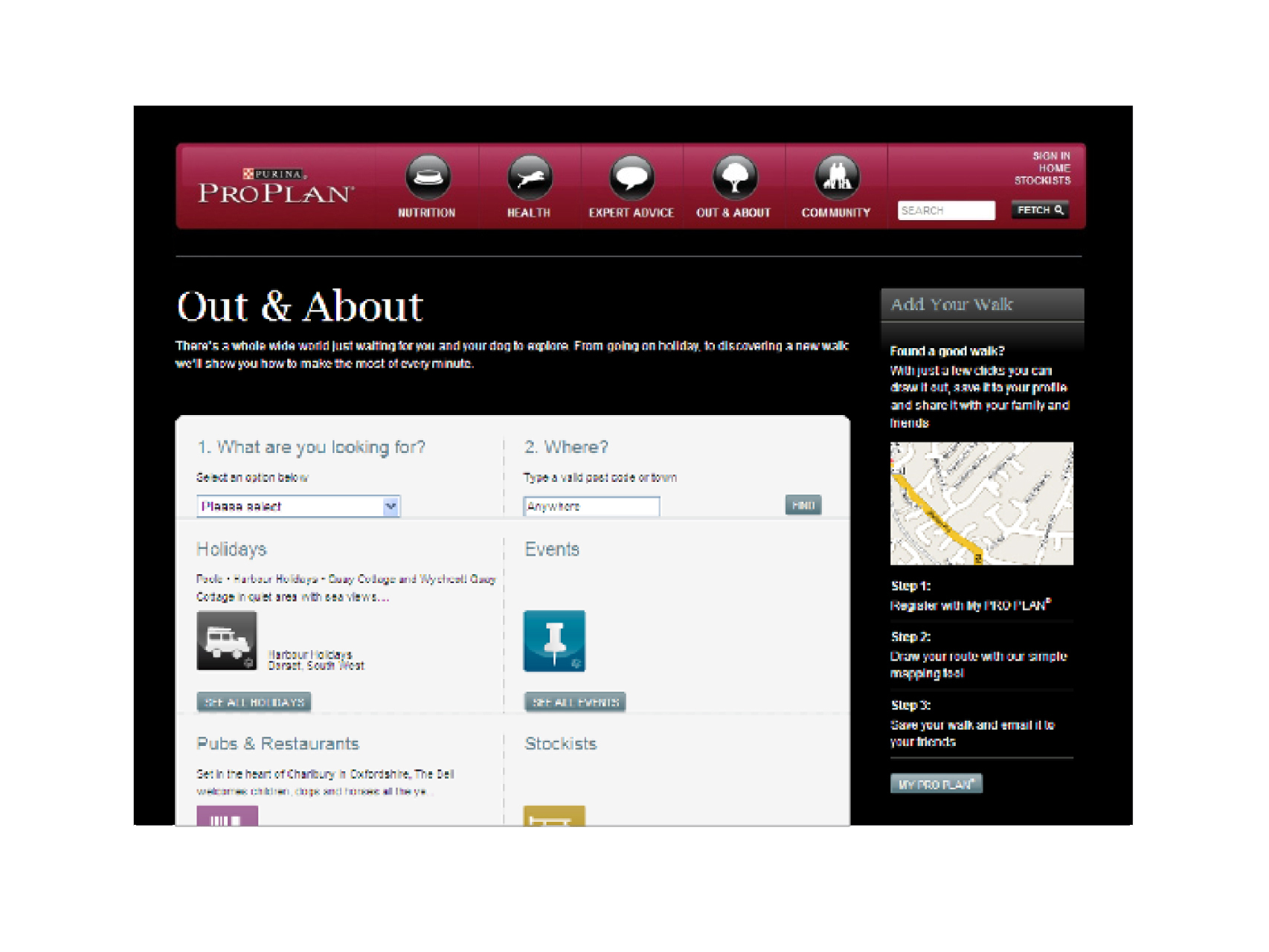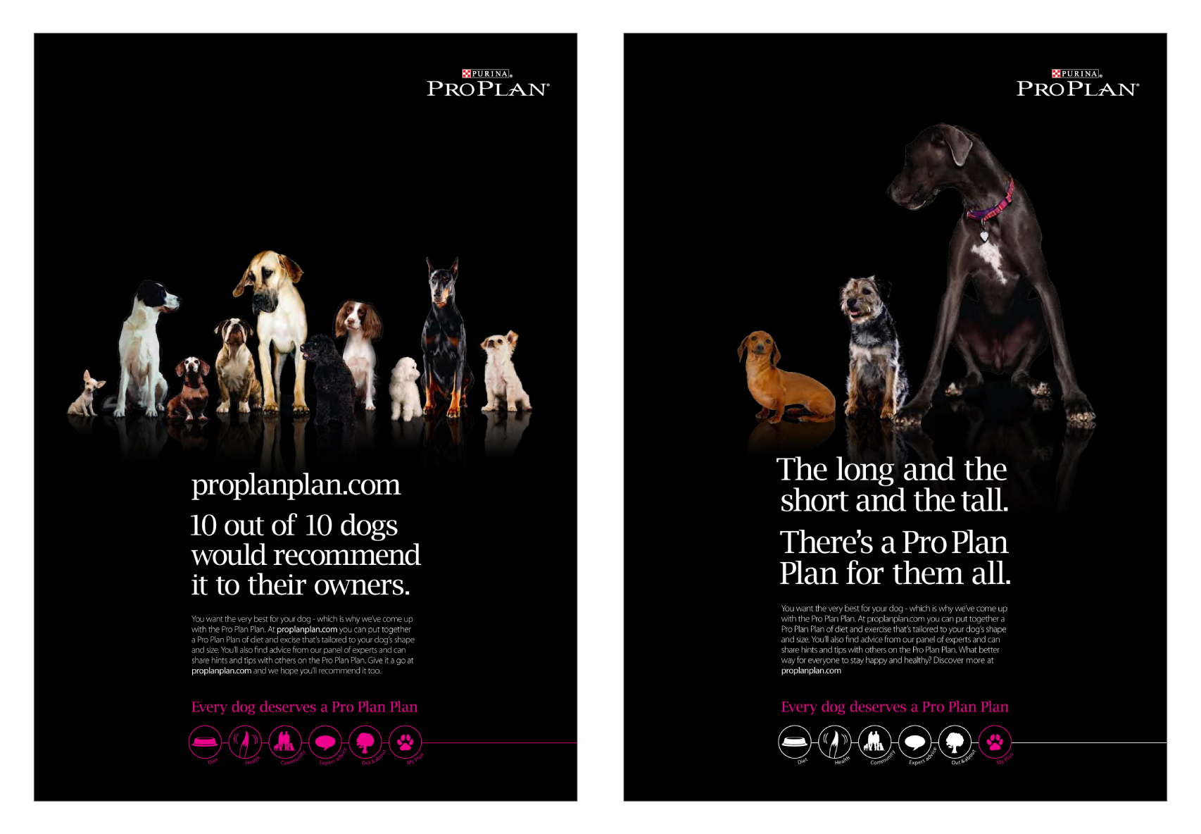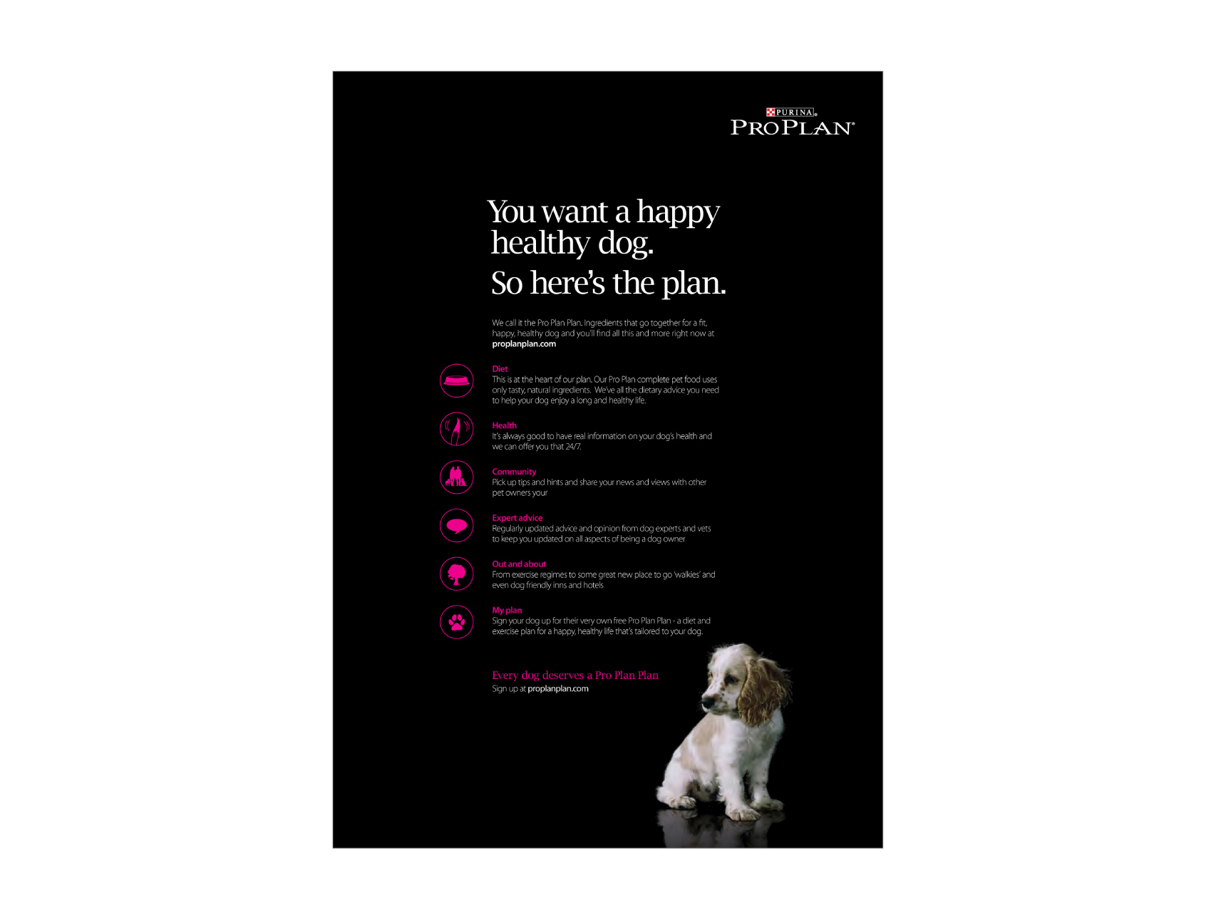 For all you dog lovers – Purina’s range of balanced nutrition. We came up with the ‘ProPlan Plan’ a specific diet and lifestyle tips that could be specifically tailored to keep every dog happy and healthy. At the heart of the ProPlan Plan was an owners website where they could share tips, stories – even their favourite ‘walkies’.